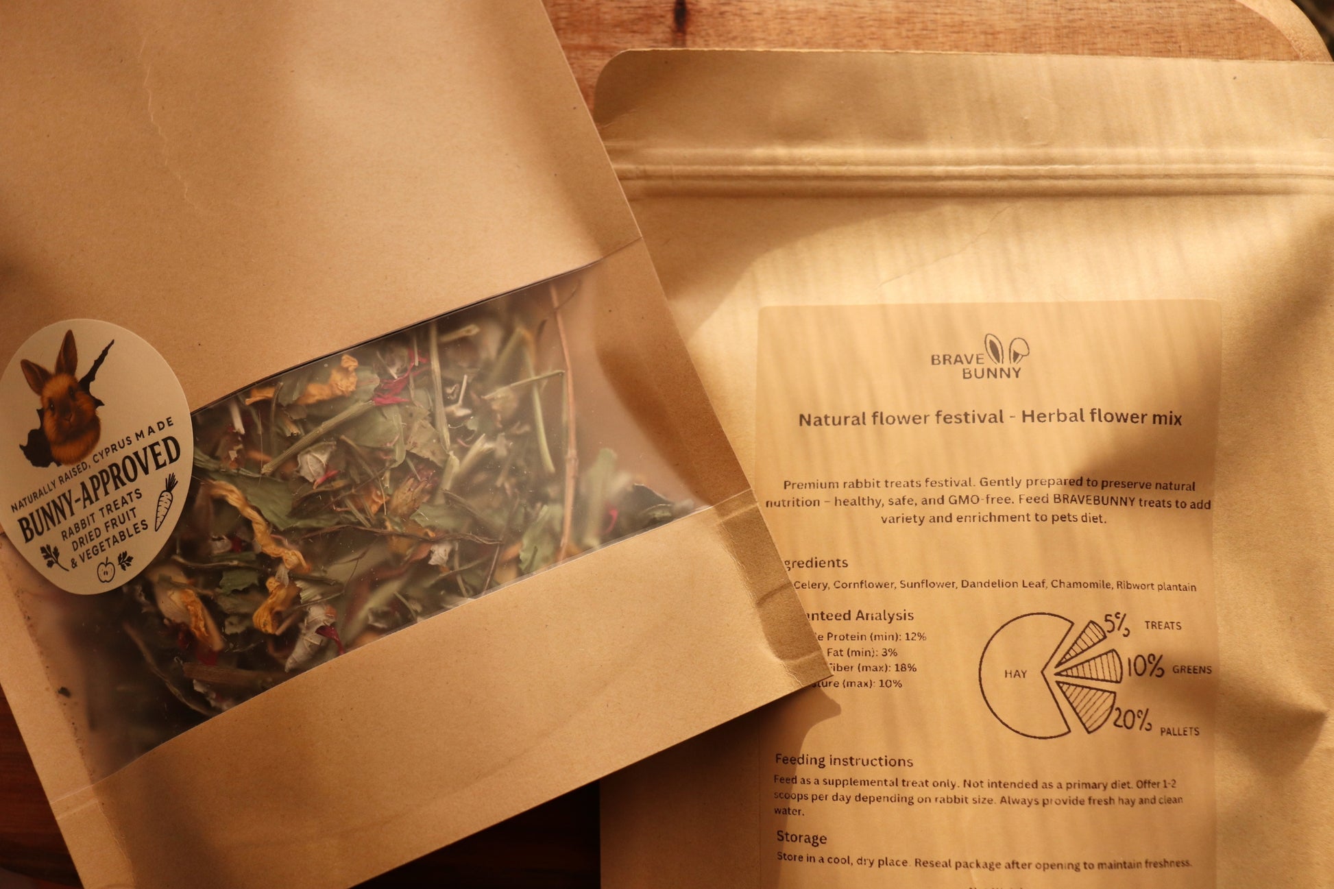 Dill – supports digestion and adds natural aroma. Celery leaves – rich in vitamins and minerals. Cornflowers – high in antioxidants and gentle on the stomach. Sunflower petals – full of natural fatty acids for a shiny coat. Dandelion leaves – liver-supporting and detoxifying. Chamomile – calming and soothing for stress relief. Ribwort Plantain – supports the respiratory and digestive system atd...